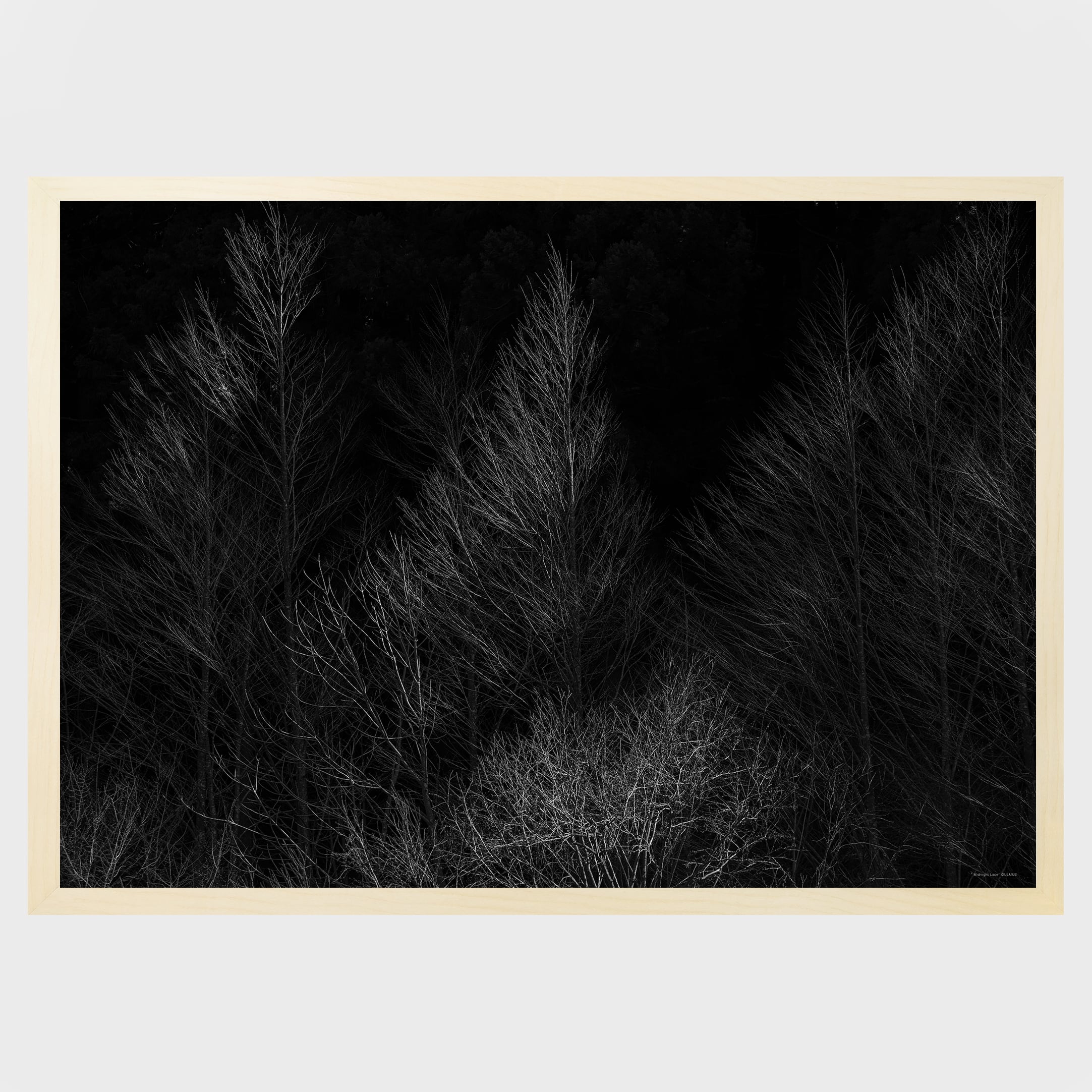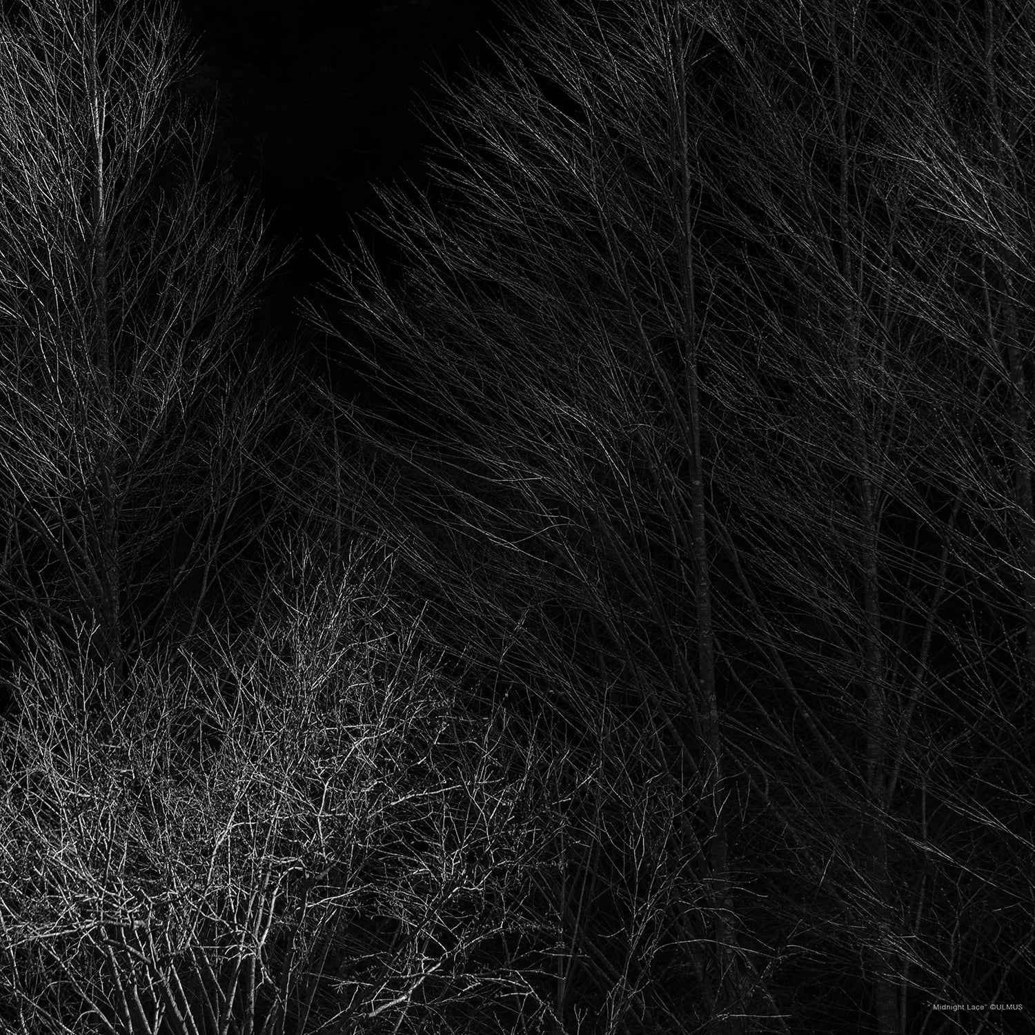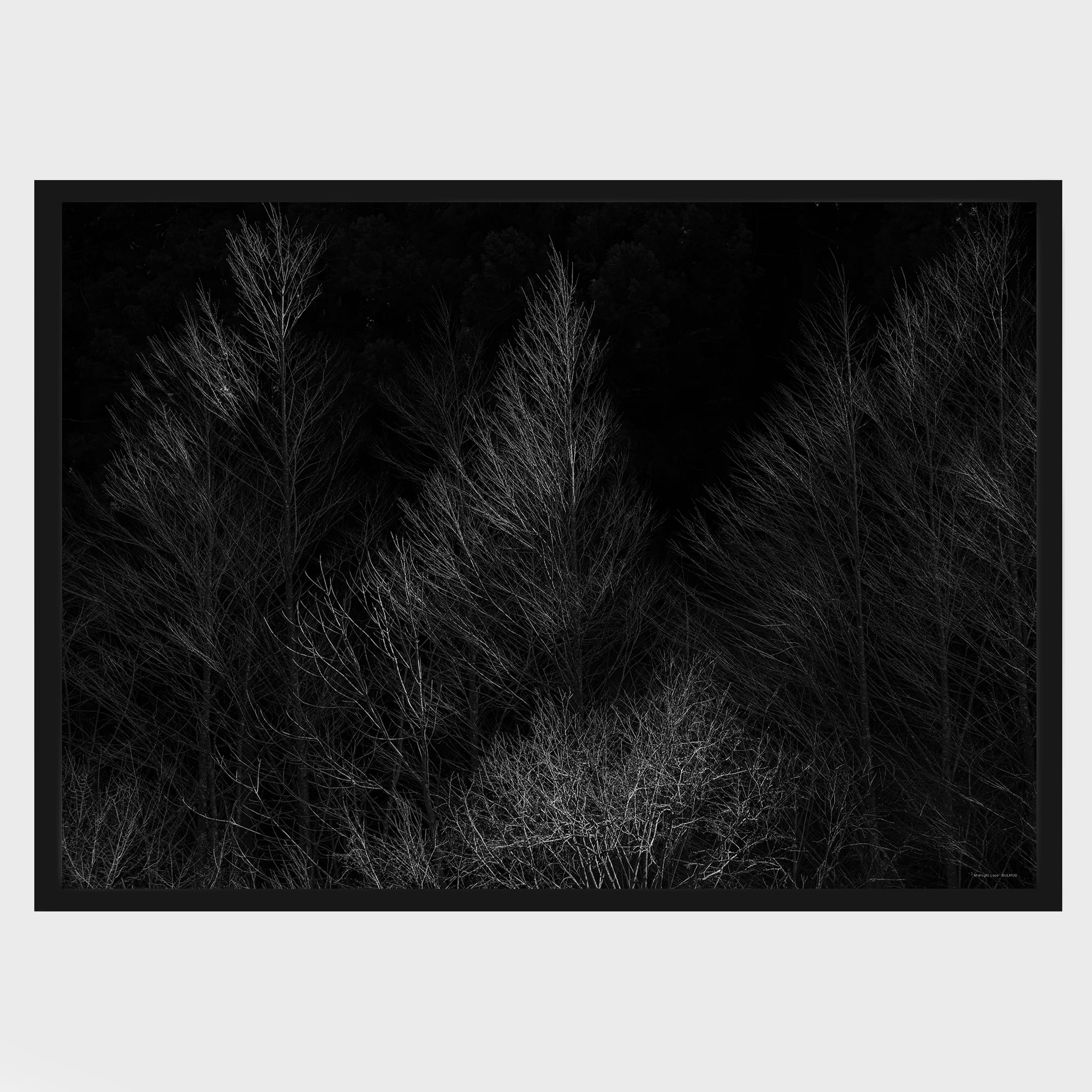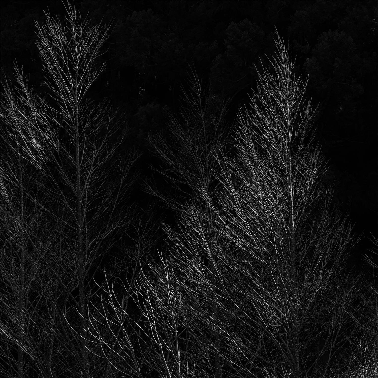 深い闇の中に浮かび上がる冬の枝の繊細な構造は、風景というよりも自然が生み出した